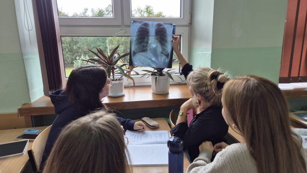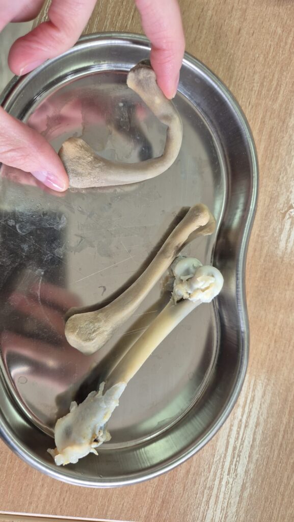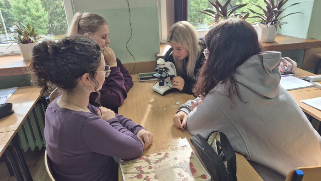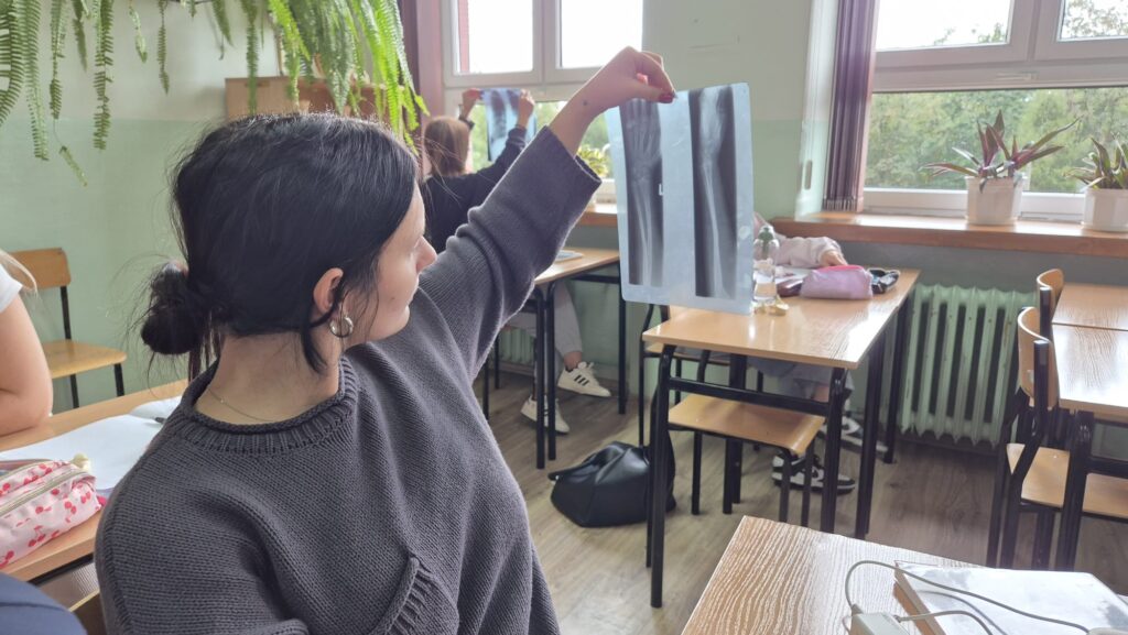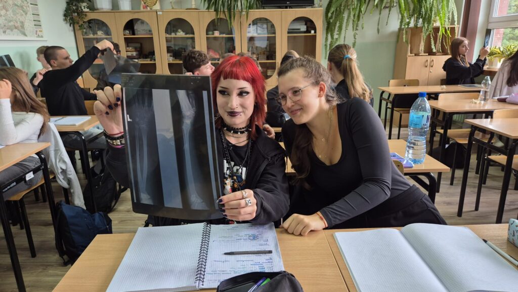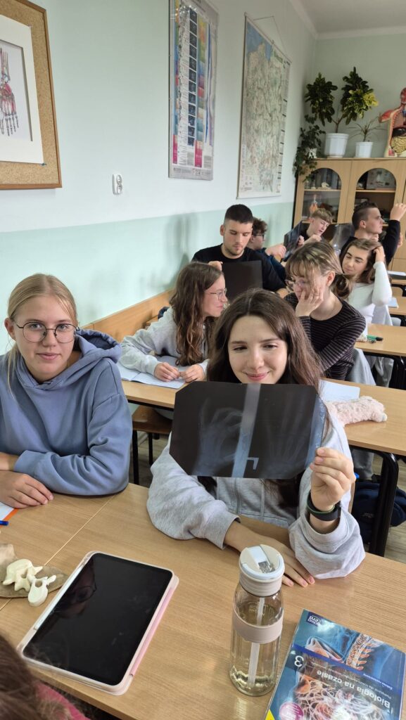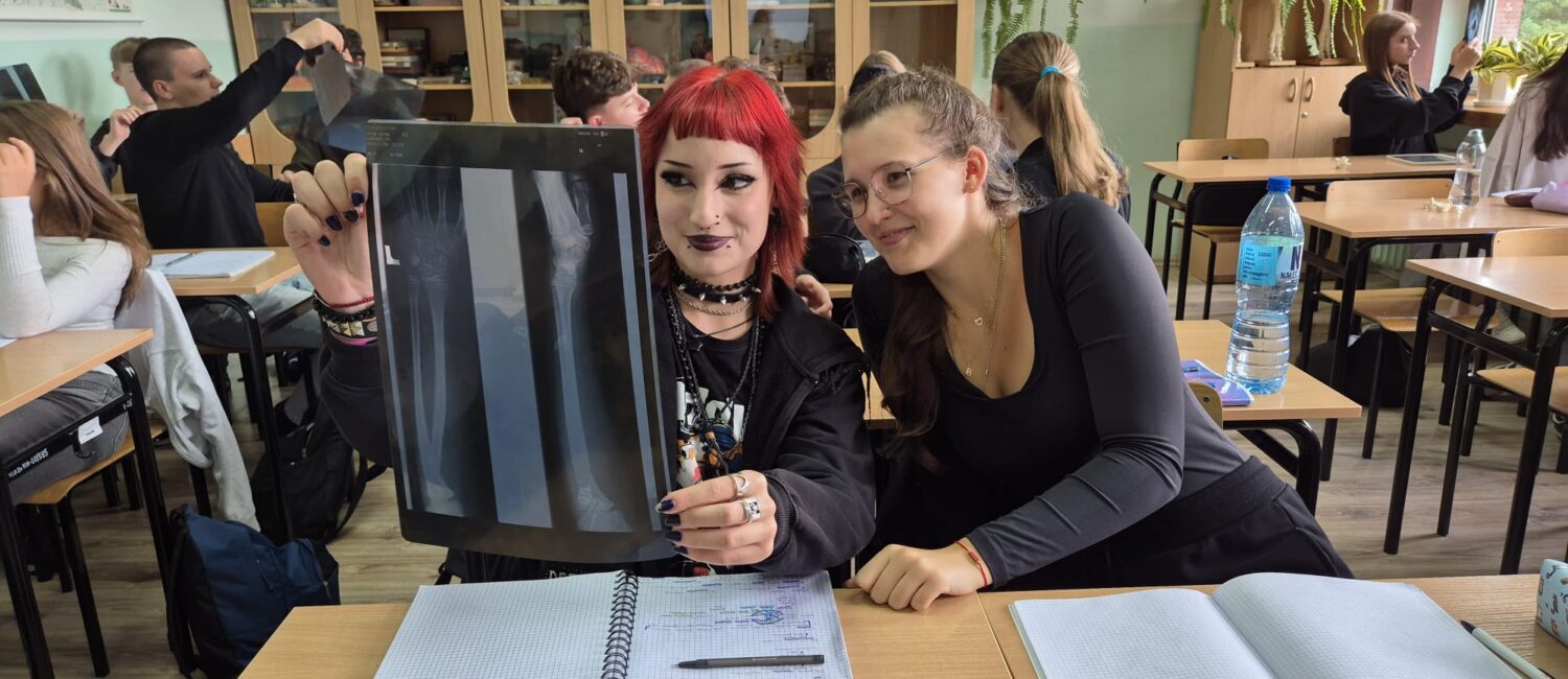 Klasa 3b z rozszerzoną biologią zgłębia tajniki własnego szkieletu. Obserwuje pod mikroskopem tkanki kostne i chrzęstne, poznaje budowę fizyczną i chemiczną kości poprzez moczenie kości w kwasie octowym. Uczniowie starają się także dokonać identyfikacji kości na zdjęciach rentgenowskich. Zajęcia z tego działu są pełne doświadczeń i praktycznych działań uczniów.