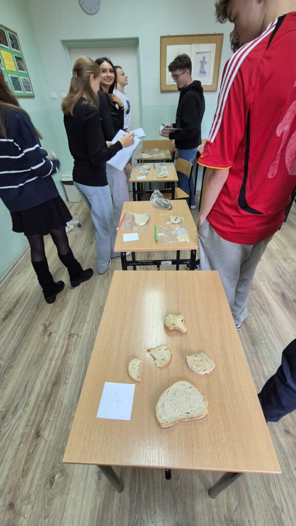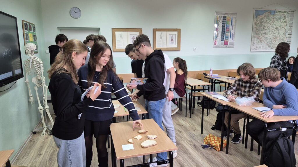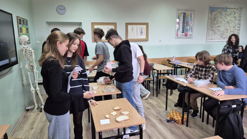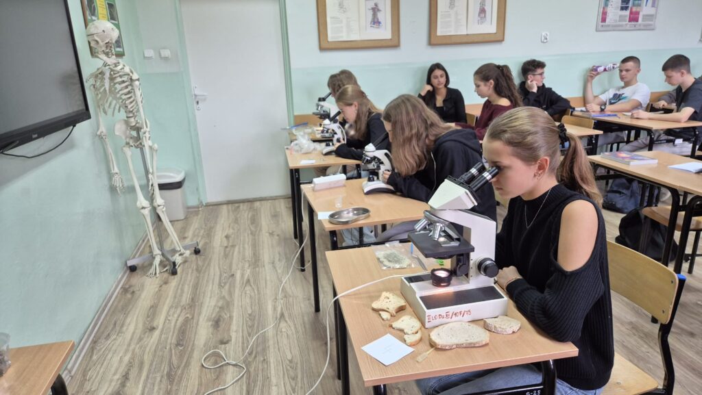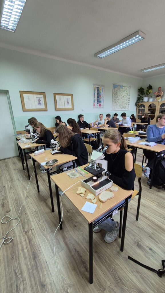Klasa 2a realizująca rozszerzoną biologię poznawała królestwo grzybów – drożdże, pieczarki i pleśniaka białego. Uczniowie dokonywali kontrolowanych hodowli pleśniaka białego w różnych warunkach a następnie analizowali wspólnie wyniki doświadczenia.