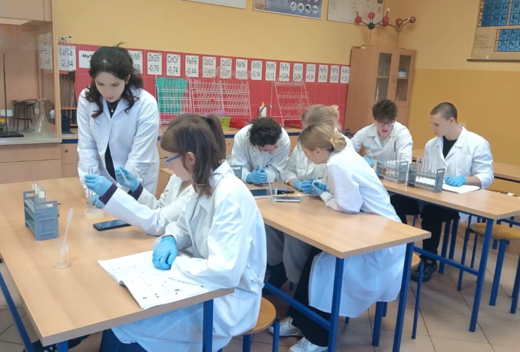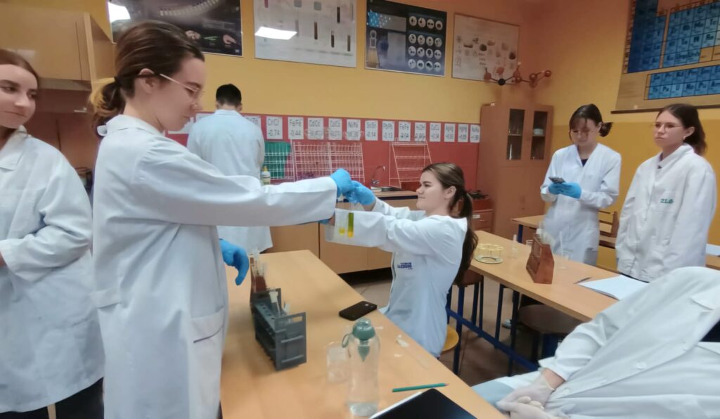 Klasa 3b realizująca chemię na poziomie rozszerzonym podczas cyklicznych warsztatów chemicznych badała właściwości barwnych związków chromu.