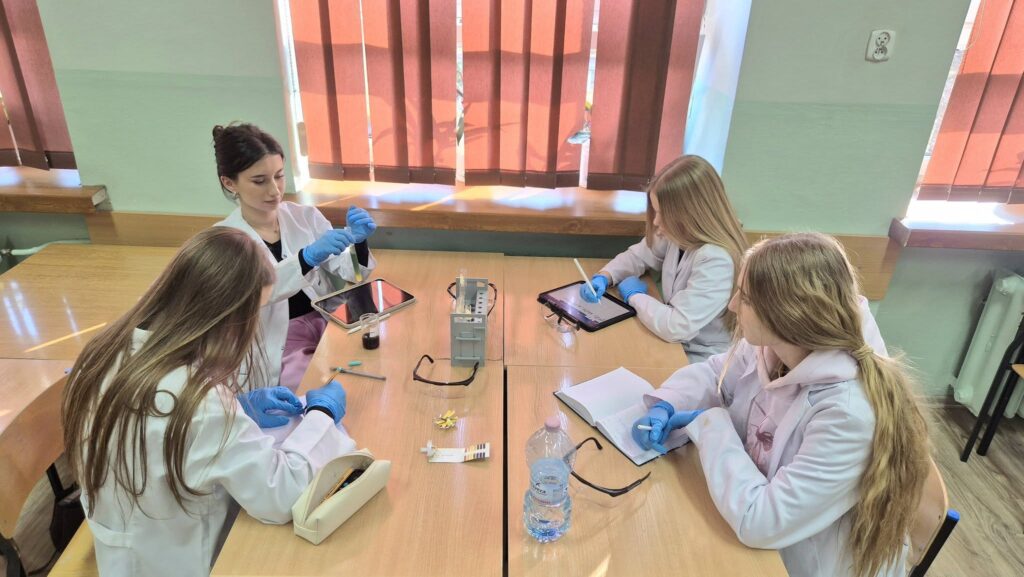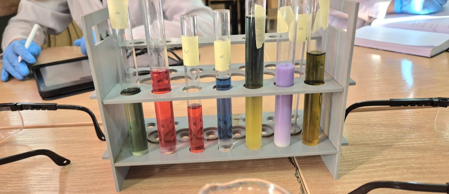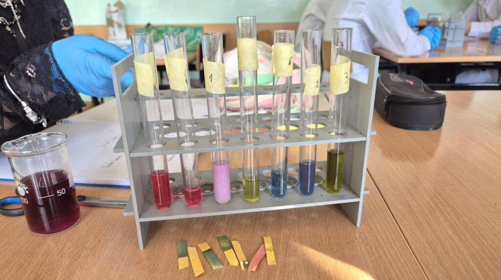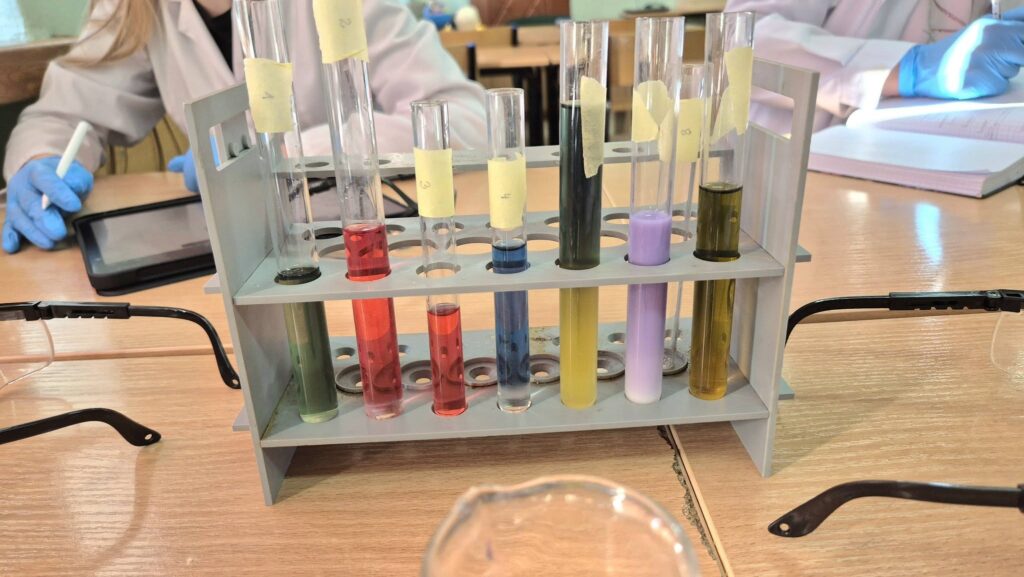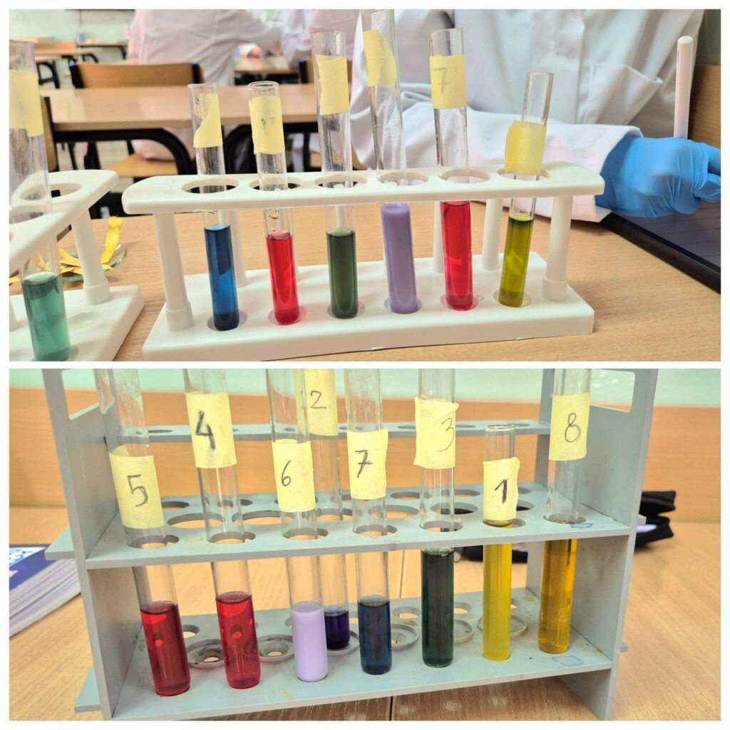 Cykliczne warsztaty biologiczne dla klasy 1b. Tym razem uczniowie badali właściwości antocyjanów w środowiskach o różnych wartościach pH np. w mleku, occie, proszku do prania, sodzie oczyszczonej. Wyniki okazały się bardzo kolorowe.